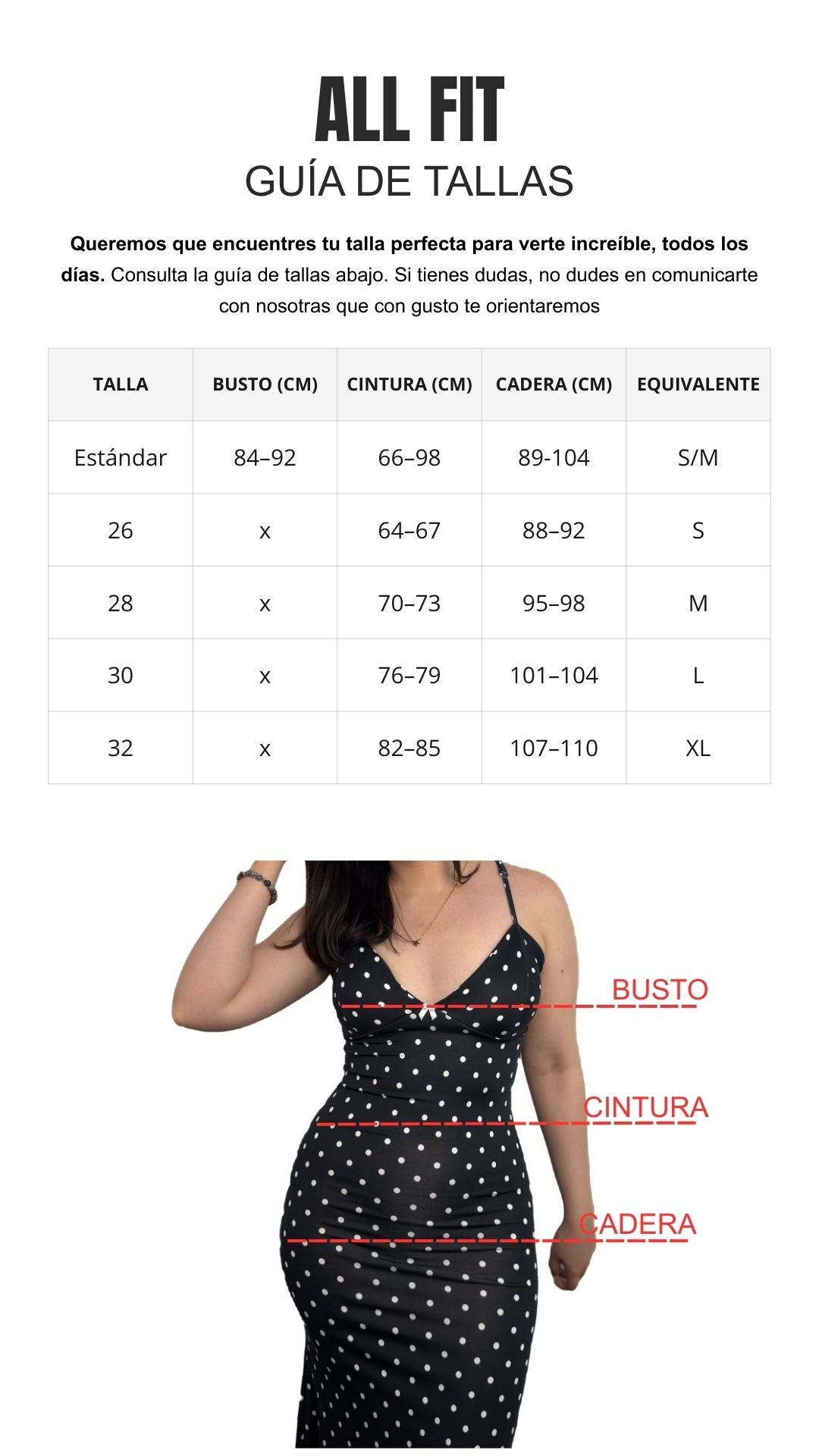 Vestido midi con tirantes regulables y estampado polka dots. Confeccionado en tela stretch que se amolda al cuerpo y define la silueta. Incluye detalle de lazo en el escote y abertura lateral para mayor comodidad.